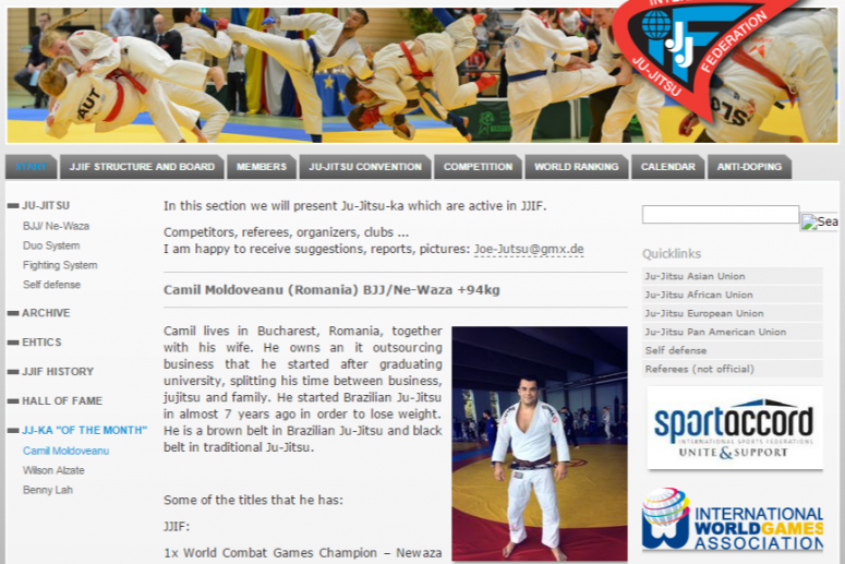 De 2 ori Campion Mondial de Newaza si o data Campion Mondial SportAccord, in cadrul Federatiei Internationale de Ju-Jitsu (JJIF), sportivul Absoluto BJJ, Camil Moldoveanu, a fost ales sa acorde un interviu pentru site-ul federatiei mai sus mentionate. Afla care este secretul succesului sau competitional si alte amanunte din cariera sportiva a sportivului nostru AICI