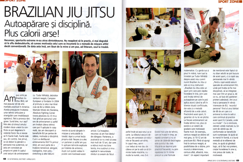 Clubul nostru a fost selectat pentru realizarea unui articol in revista „Ce se intampla, doctore?”. Unul dintre redactorii publicatiei, Paula Rotaru, a facut un antrenament de arte martiale, Brazilian Jiu Jitsu, sub indrumarea lui Tudor Mihaita. Articolul rezultat in urma acestei experiente poate fi citit in ultimul numar al revistei mai sus mentionate.