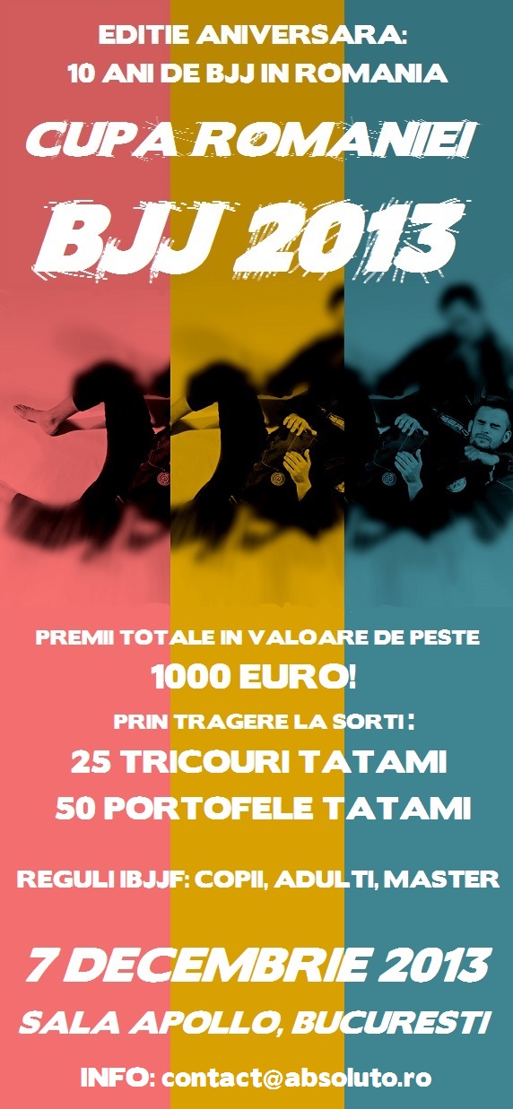 Vino sa sarbatoresti 10 ani de BJJ in Romania la a 8-a editie a celei mai tari competitii de BJJ din Romania: Cupa Romaniei, organizata de clubul Absoluto! Evenimentul va avea loc pe 7 decembrie 2013, la Sala Apollo, in Bucuresti.