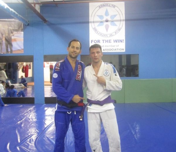 Remus Corbei, dublu Campion European al Absoluto BJJ a primit ieri seara centura mov. Aflat pe lista promovarilor la seminarul sustinut in urma cu 2 saptamani de Eddie Kone, Remus nu a putut fi prezent din motive obiective. Tudor Mihaita, liderul Absoluto, i-a inmanat acestuia centura mov, la revenirea la antrenamente. Felicitari, Remus!