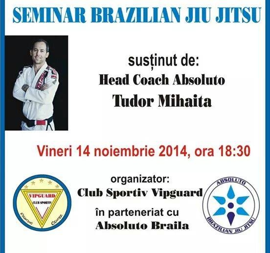 Tudor Mihaita, liderul Absoluto, va sustine astazi un seminar de Brazilian Jiu Jitsu la Tecuci, pentru cluburile afiliate din Tecuci si Braila, la invitatia antrenorilor Luis Turcu (Vipguard Absoluto Tecuci) si Nicolae Garba (Absoluto Braila).